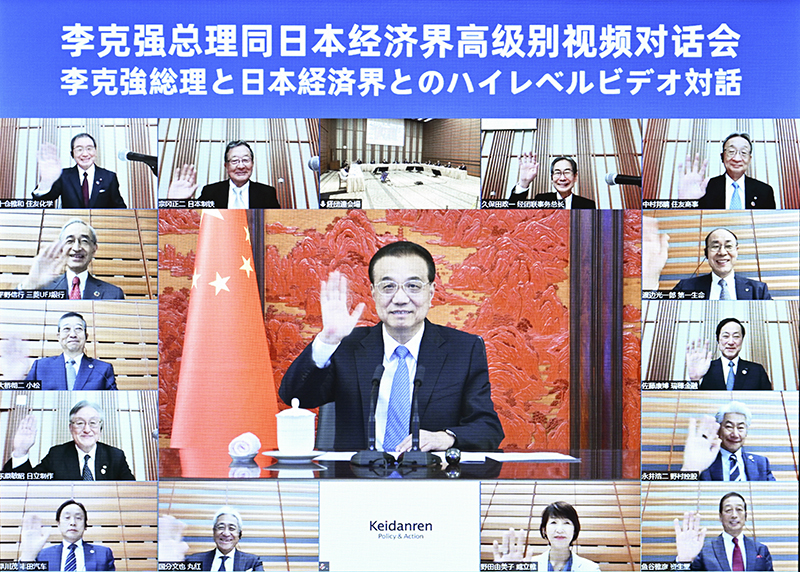9月22日下午,国务院总理李克强在北京中南海紫光阁同日本经济界代表举行高级别视频对话会。新华社记者 燕雁 摄
